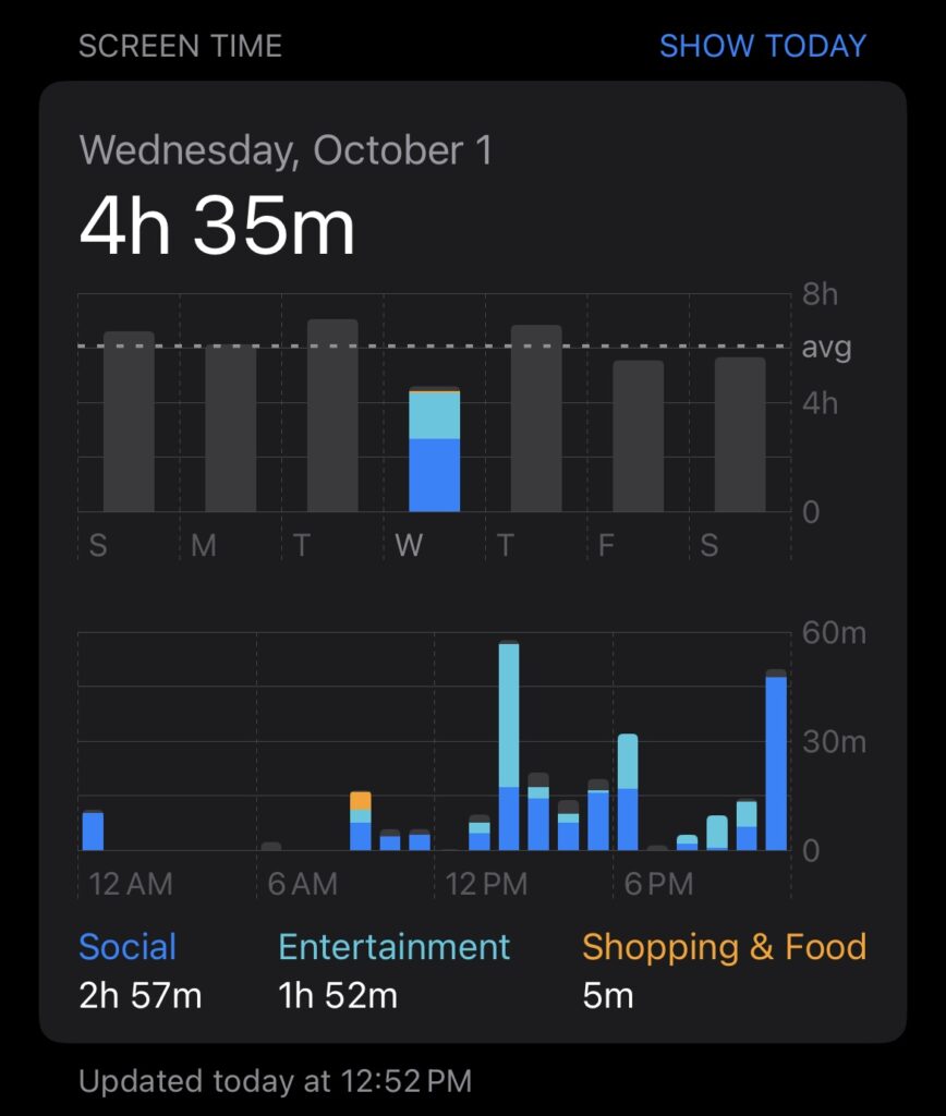 I also looked at my iPhone screentime analytics to get a fuller idea of how much time I spend on my phone and what exactly I do with that time.