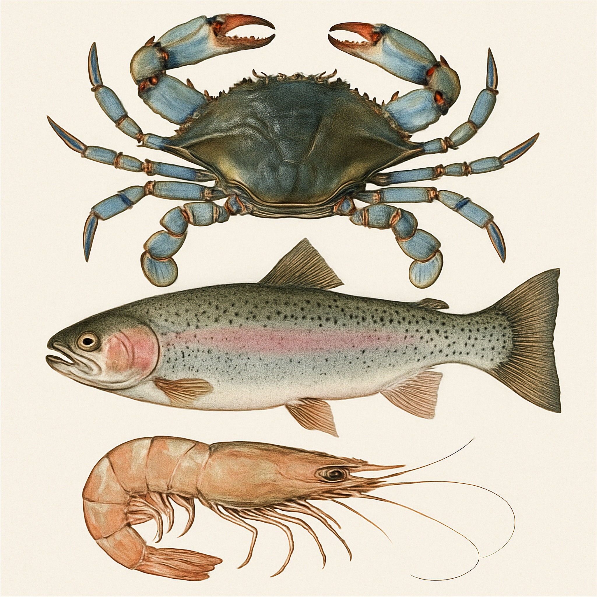 BLUE CRAB, RAINBOW TROUT AND SHRIMP